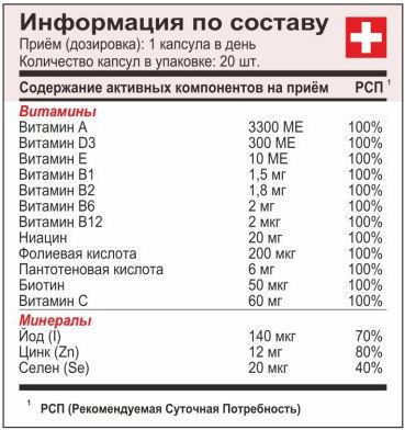 Комплекс разработан для восполнения физиологической потребности в витаминах, йоде, цинке и селене для взрослых и детей с 7 лет.
