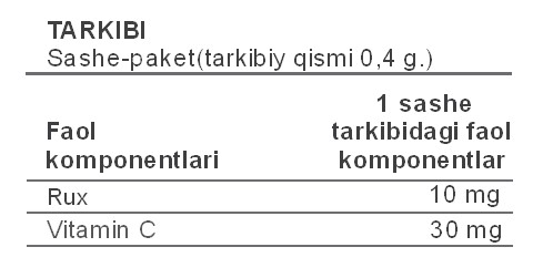 • Dozasini o’lchash va qo’llashda qulay — 1 sasheda: 10 mg rux va 30 mg C vitamini suvda eruvchan shaklda.