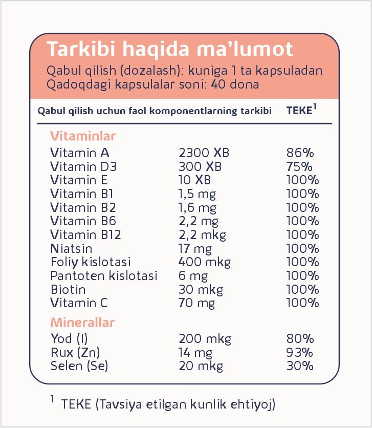 • Kuniga bor-yo’g’i 1 dona kapsula vitamin va mikroelementlarga bo’lgan kunlik ehtiyojni ta’minlaydi.